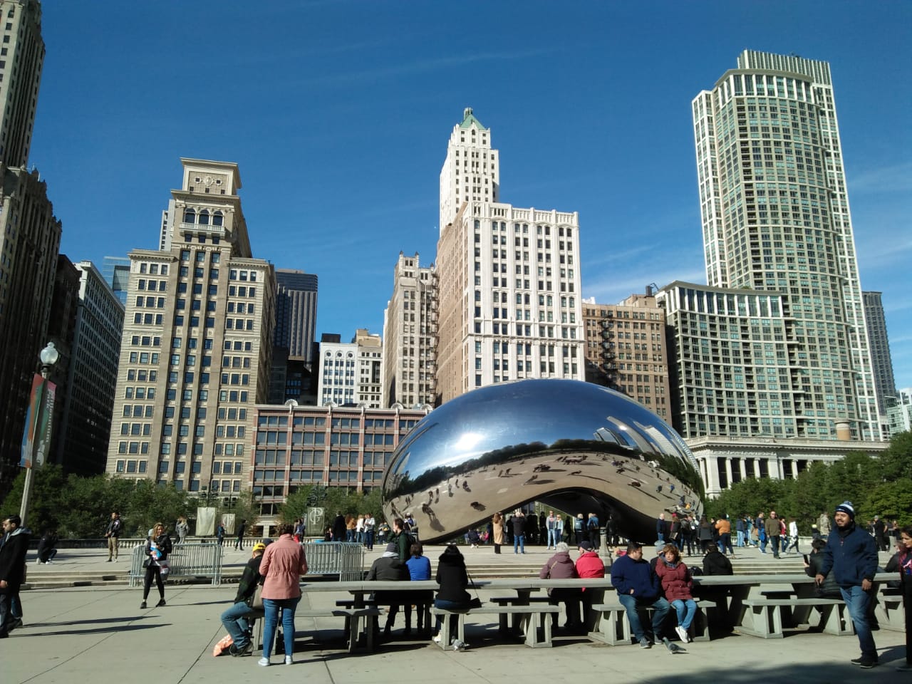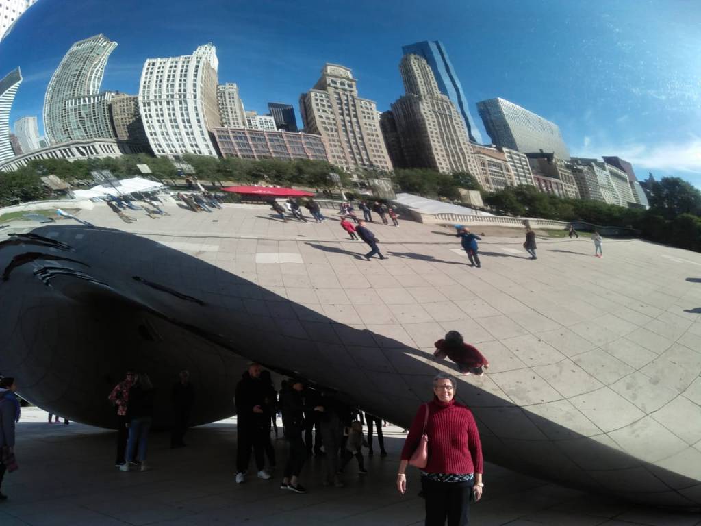 Our first stop was at Cloud Gate the bean shaped steel sculpture. One of the celebrated works of the Indian born sculptor,Anish Kapur; it is also called The Bean.This outdoor sculpture reflects the sky for the most part and bridges the gap between the viewer and the sky….this is the concept and hence the name cloud gate.It reflects the skyscrapers around it and one can easily stand underneath this giant steel bean.You can see your own reflection against the background of the skyscrapers. We clicked a couple of pictures here.