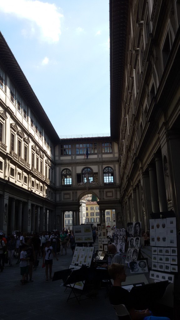 The Uffizi Gallery with the narrow street between the two wings lined by street artists
