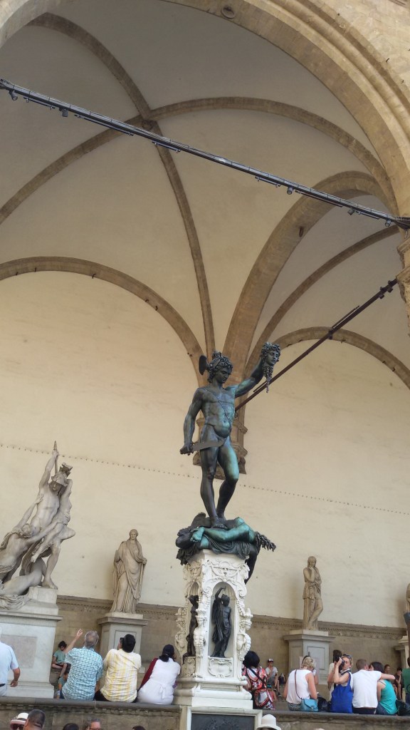 This is essentially an open air sculpture gallery of Renaissance art including the Medici Lions. It has wide arches open to the street resting on columns.