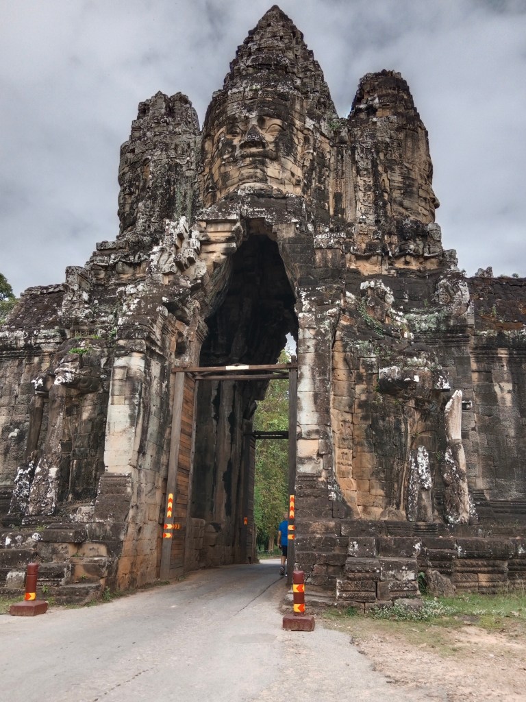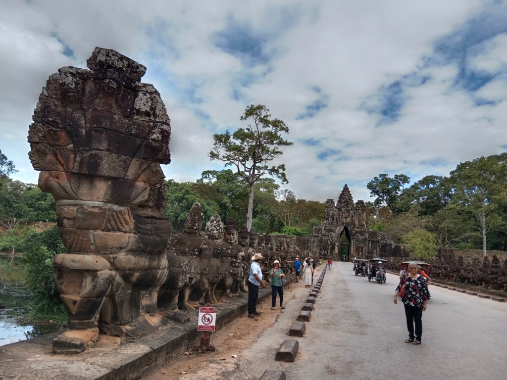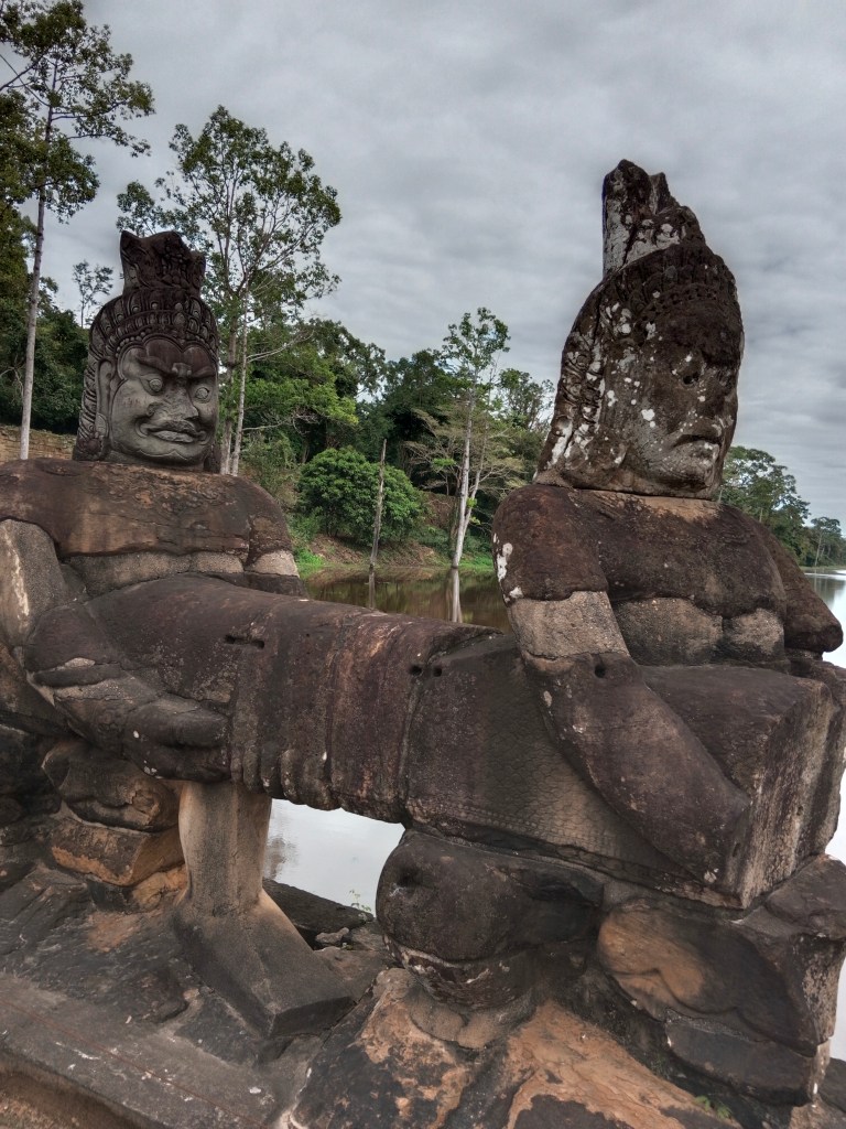A causeway spans the moat in front of each tower. This causeway has a row of faces of Devas on the left and Asuras on the right holding a Naga. The gates were probably closed with wooden gates. The South gate is by far the most visited as it is now the main entrance to Angkor Thom.