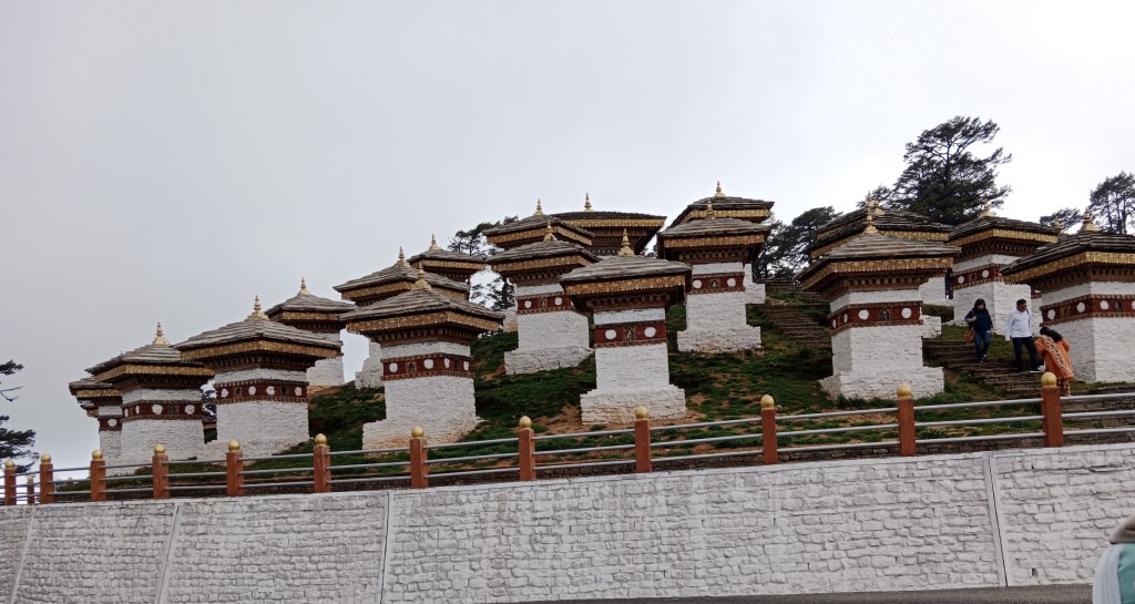 Chortens are important monuments or shrines in Bhutanese culture and are also called Stupas. Typically, they are tombs of saints. At Dochula Pass there are 108 such Chortens built in memory of the soldiers who lost their life fighting Assamese insurgents from India in 2003. After the Bhutanese were successful in defeating the insurgents, the Queen mother ordered the building of these Chortens .