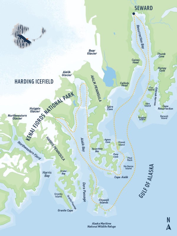 Map of Kenai Fjords National Park and the cruise route