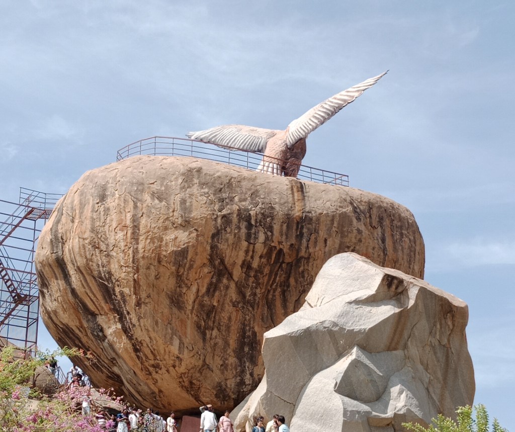 As explained in the legend, Jatayu is intricately connected with Lepakshi . No wonder then that a huge Jatayu image is constructed on a rocky hillock close to the temple. It is called the Jatayu theme park. The giant Jatayu seems to be overlooking the whole town.