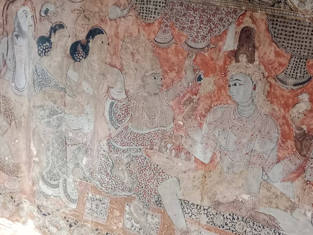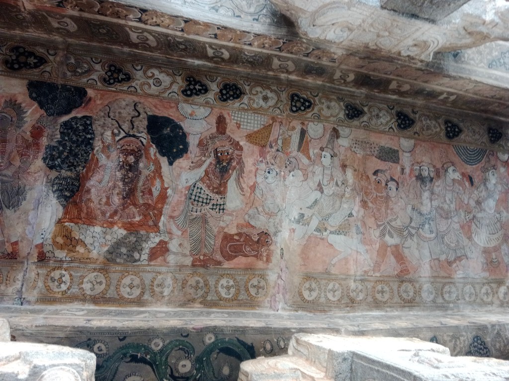 One of the frescos on the ceiling of the Artha Mantapa is supposed to be the largest one in Asia. The paintings depict the costumes of that period but due to age related fading, many of the features are not very clear.
