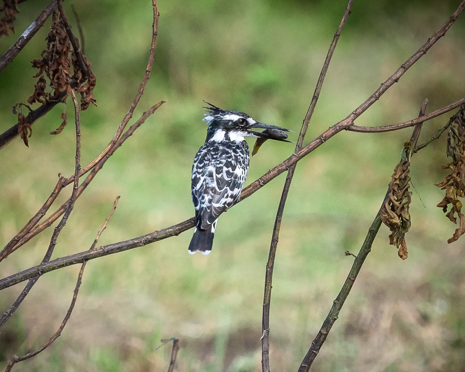 A Pied Kingfisher sits pretty with its prey safe in his beak