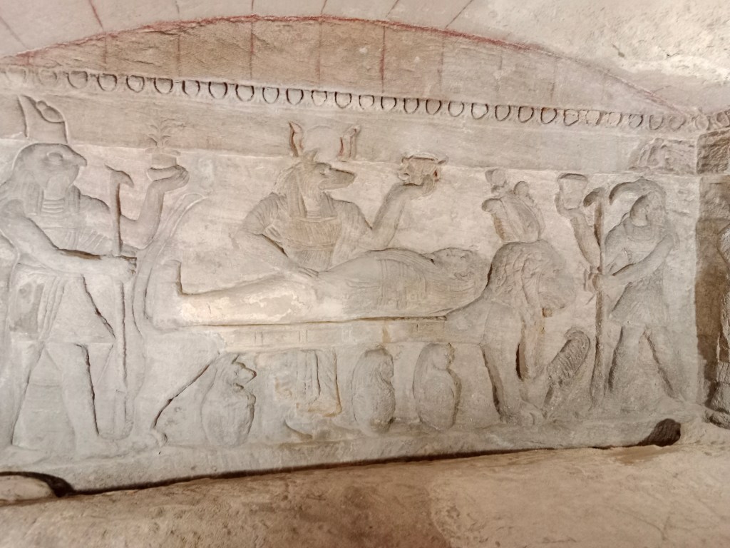 The tomb chamber is decorated with the sculpture of the jackal headed God Anubis (God of mummification) performing a mummification of a body on a lion headed bed. Vulture headed Gods supervise the process. The organs of the body are believed to have been removed from the body and preserved in jars called canopic jars.