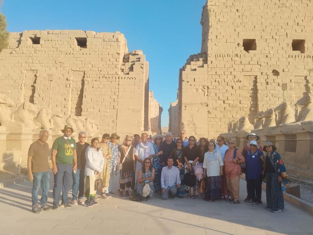 Our group in front of the temple with the first set of pylons behind us, the avenue of rams on either side and some parts of the serial pylons seen along the passage behind.