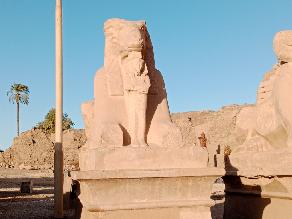 On close observation, each of the statues has the body of a lion in sitting position with the head of a ram . A statue of the king is held between the legs of the lion as if protecting the king. Some of these statues are partly damaged but most of them are intact. This avenue leads us to the first pylon marking the entrance .