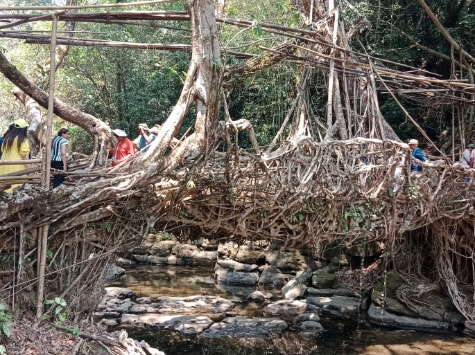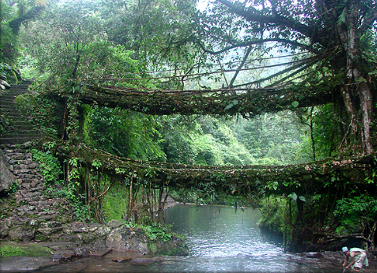 Located a few kilometers from Mowlynnong, ( the cleanest village in Asia) ; a visit here required a short trek along a path with stone steps . It lies across the Thyllong river ( river of Gods) in a fairly densely forested area and is about 30 feet long. The trees that form this bridge were planted in 1840.