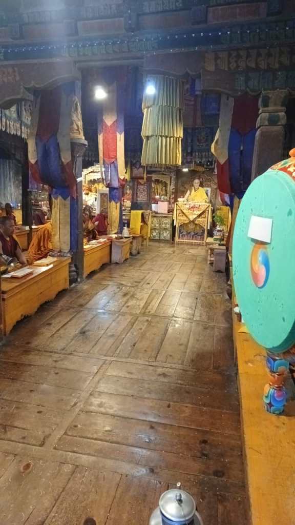They have typical architectural features with white exteriors , windows lined by delicately carved woodwork and painted in red, black and yellow colours , stupas in the courtyard, and multi colour prayer flags fluttering all over. Prayer wheels of different sizes adorn both the exterior and interior and the soothing chants of Buddhist hymns calms our minds as we explore them. Monasteries are store houses of ancient manuscripts, thangka paintings and house beautiful statues.