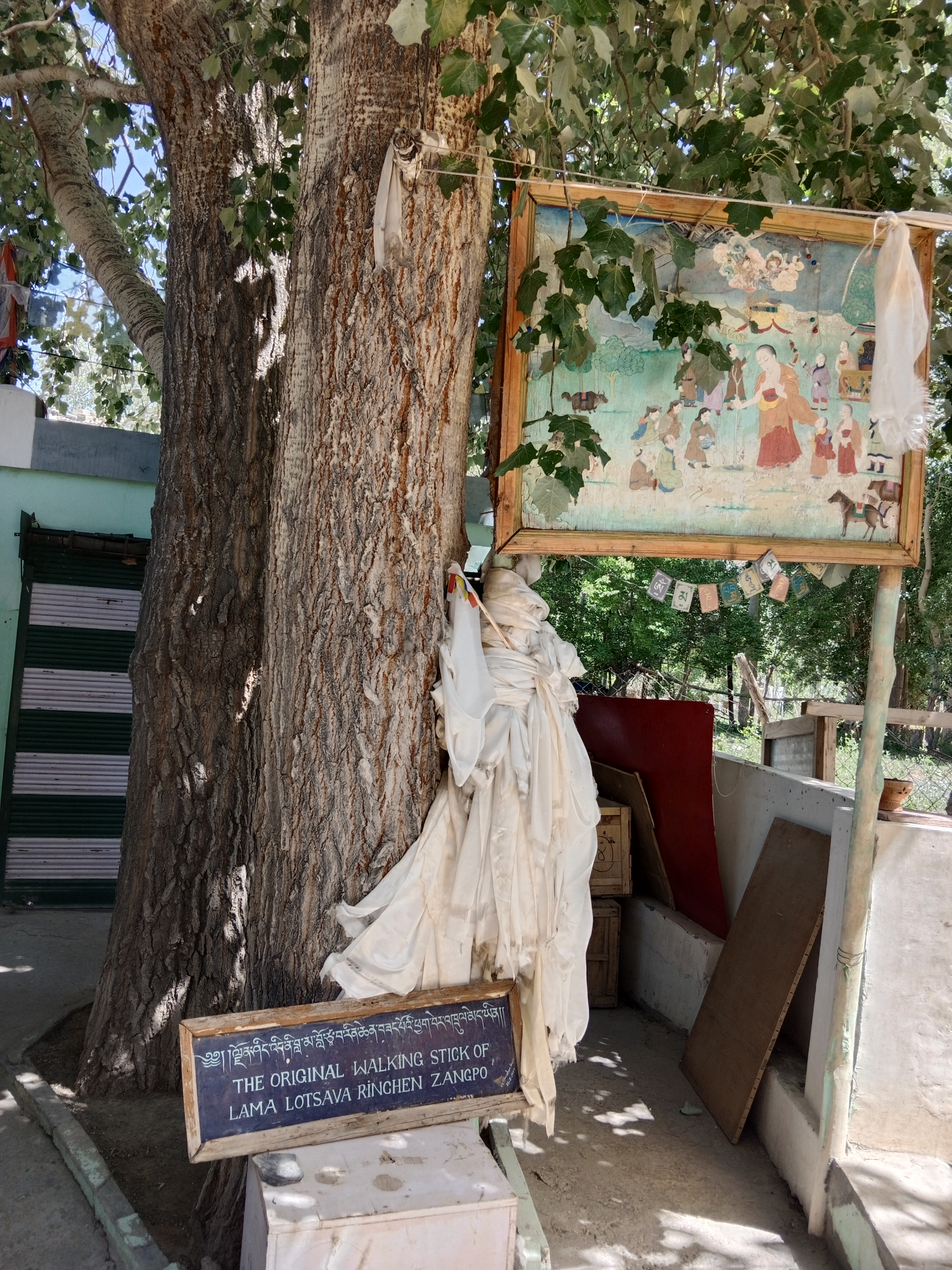 A walking stick belonging to the lama from which a tree has grown is preserved at the complex. It is decorated with the traditional Ladakhi white scarf .