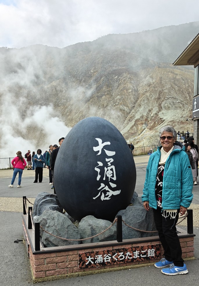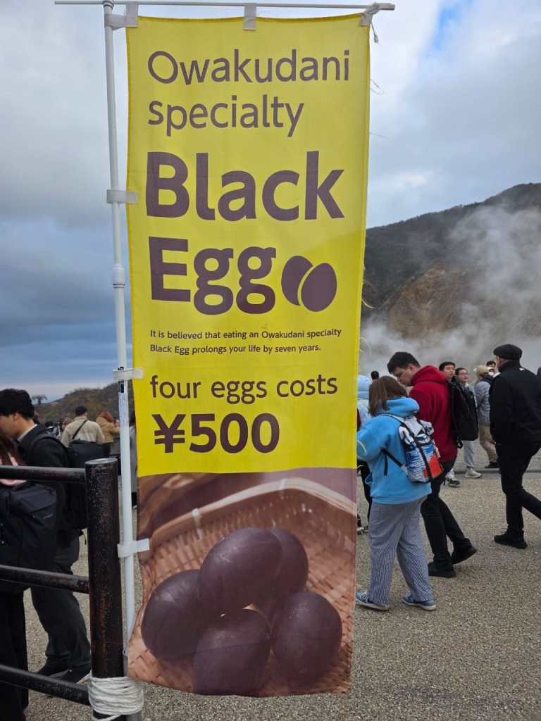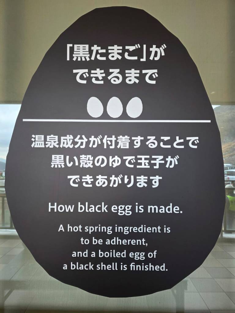 When eggs are boiled in the spring water, the iron in the spring water combines with hydrogen sulphide gas forming iron sulphide which sticks on to the shell making it black. Black eggs are edible and available for purchase and it is the speciality of Owakudani.