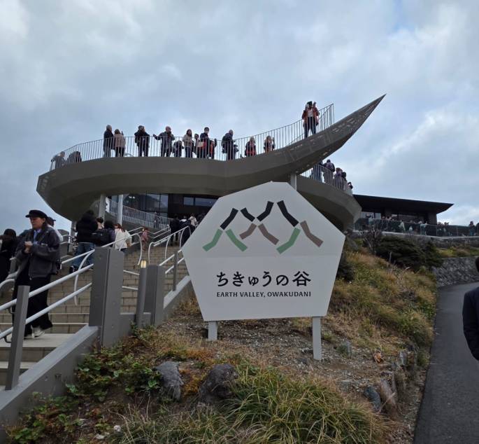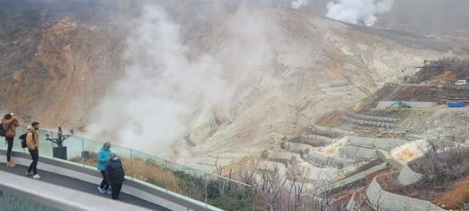The Hakone volcano has a caldera measuring 11 kms in diameter and Lake Ashi is a lake formed in the caldera. This caldera has formed gradually over thousands of years and has developed edifices . Owakudani is one of them and a living example of the powerful volcanic forces beneath Mount Hakone.