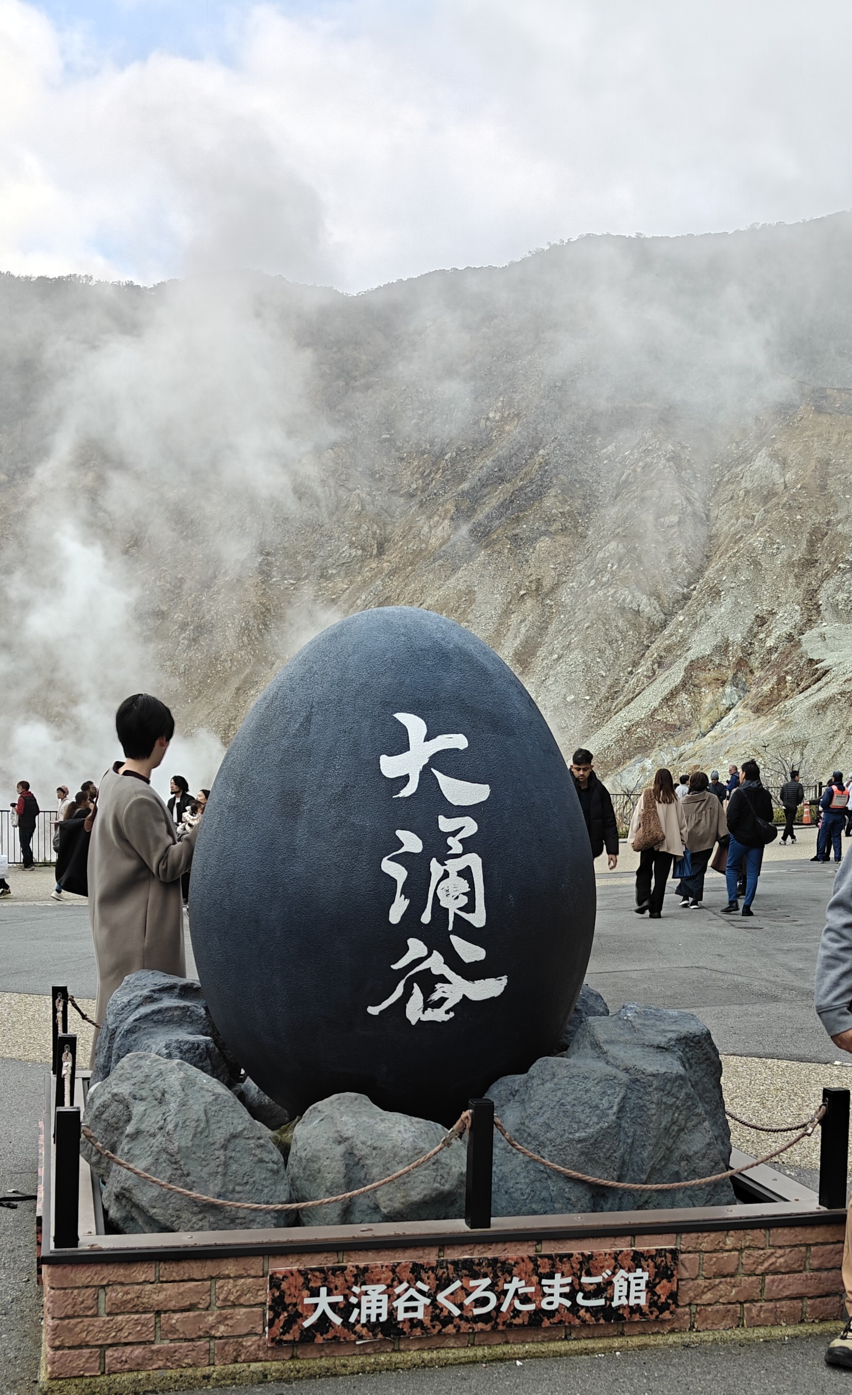 When eggs are boiled in the spring water, the iron in the spring water combines with hydrogen sulphide gas forming iron sulphide which sticks on to the shell making it black. Black eggs are edible and available for purchase and it is the speciality of Owakudani.