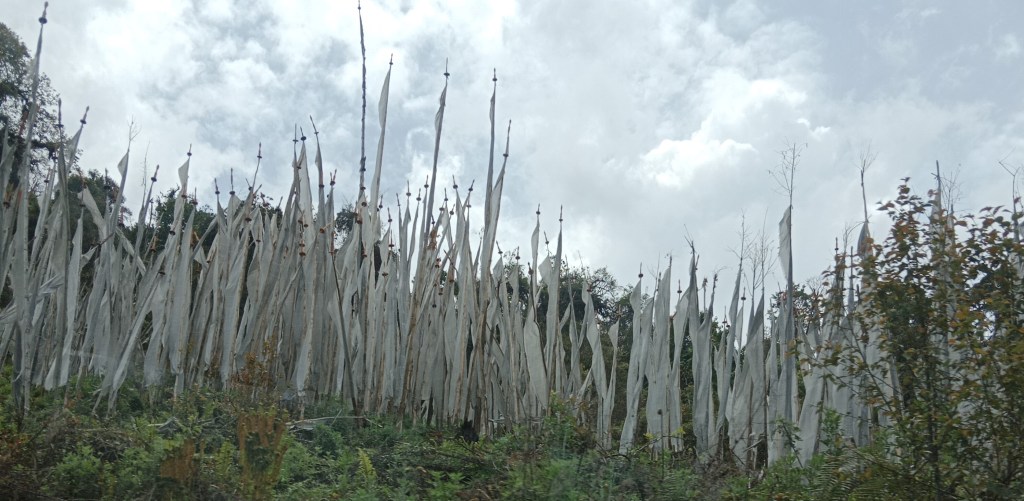 White flags : These are tied by relatives of a dead person in his honour and they too contain prayers which will give salvation to the soul. 108 white flags are generally put up for one person. We found several such groups of flags on the hillside everywhere as we drive along.