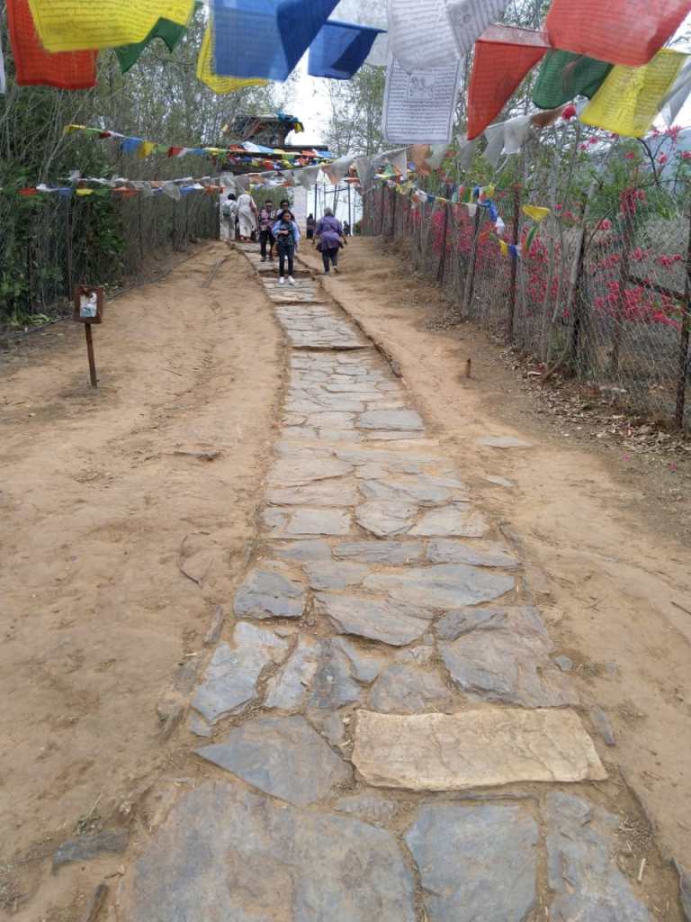 At places there are wooden steps and at places stone steps too and we did not find it very difficult . The company and the walking stick provided the much needed moral and physical support. The colourful prayer flags added to the charm…