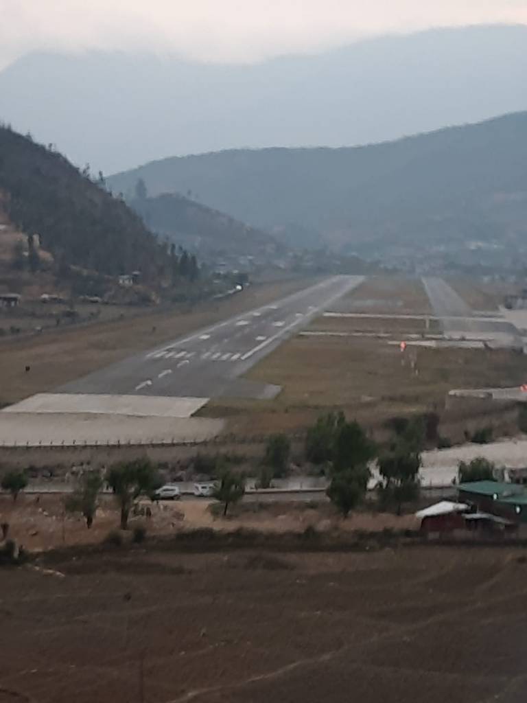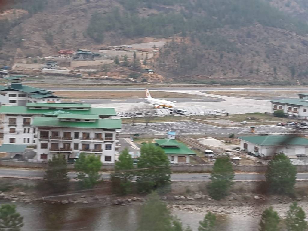 Paro airport with the road and Paro river adjacent to it